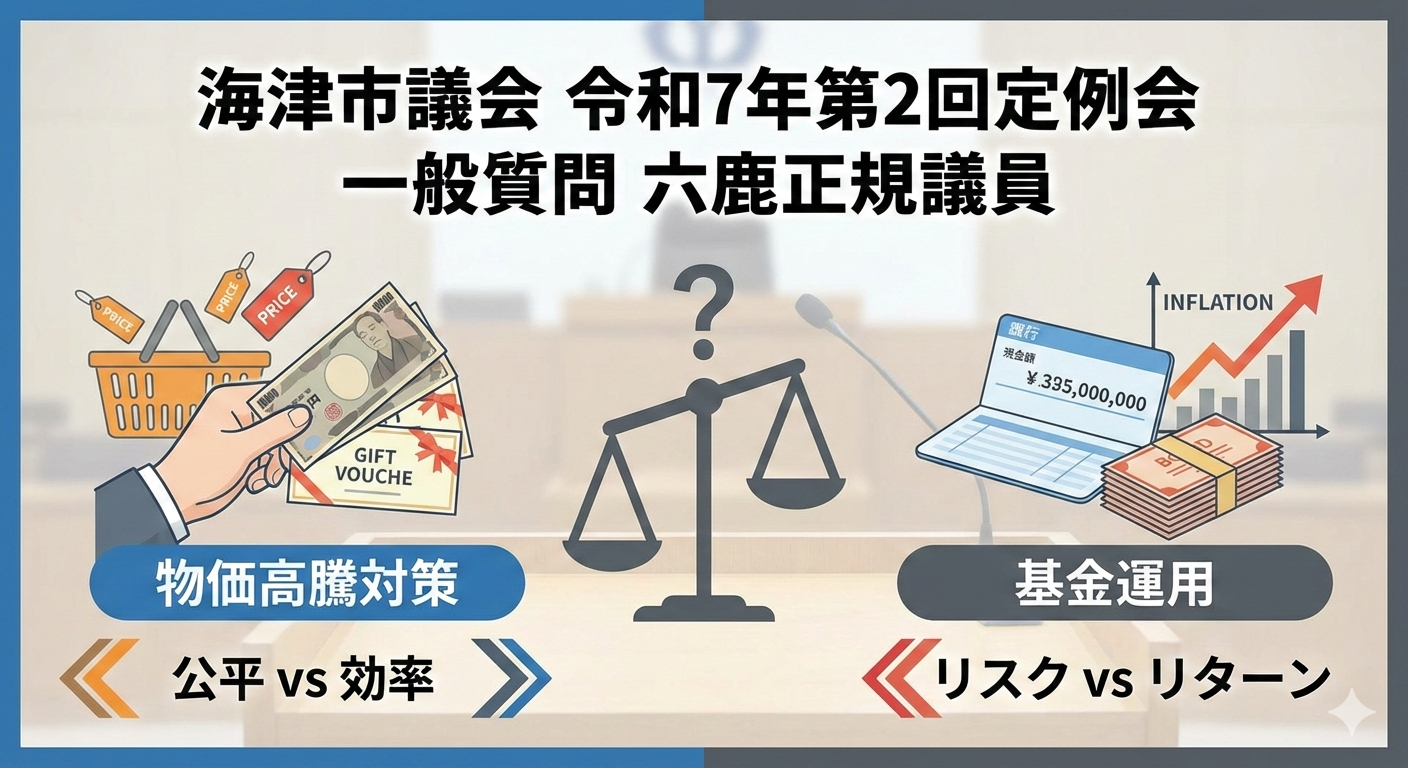 令和7年第2回定例会の一般質問において、六鹿正規議員は「物価高騰対策」と「基金運用」の2点を軸に粘り強く質問した。