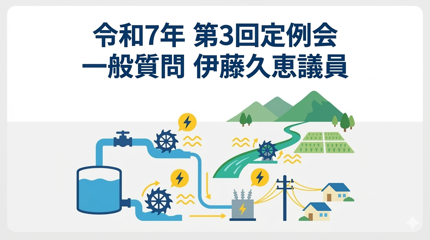 伊藤久恵議員は水道管と農業用水路の双方について導入可能性を多角的に追求したが、いずれも流量不足から採算が立たないとの理由から市は一貫して慎重な姿勢を示した。