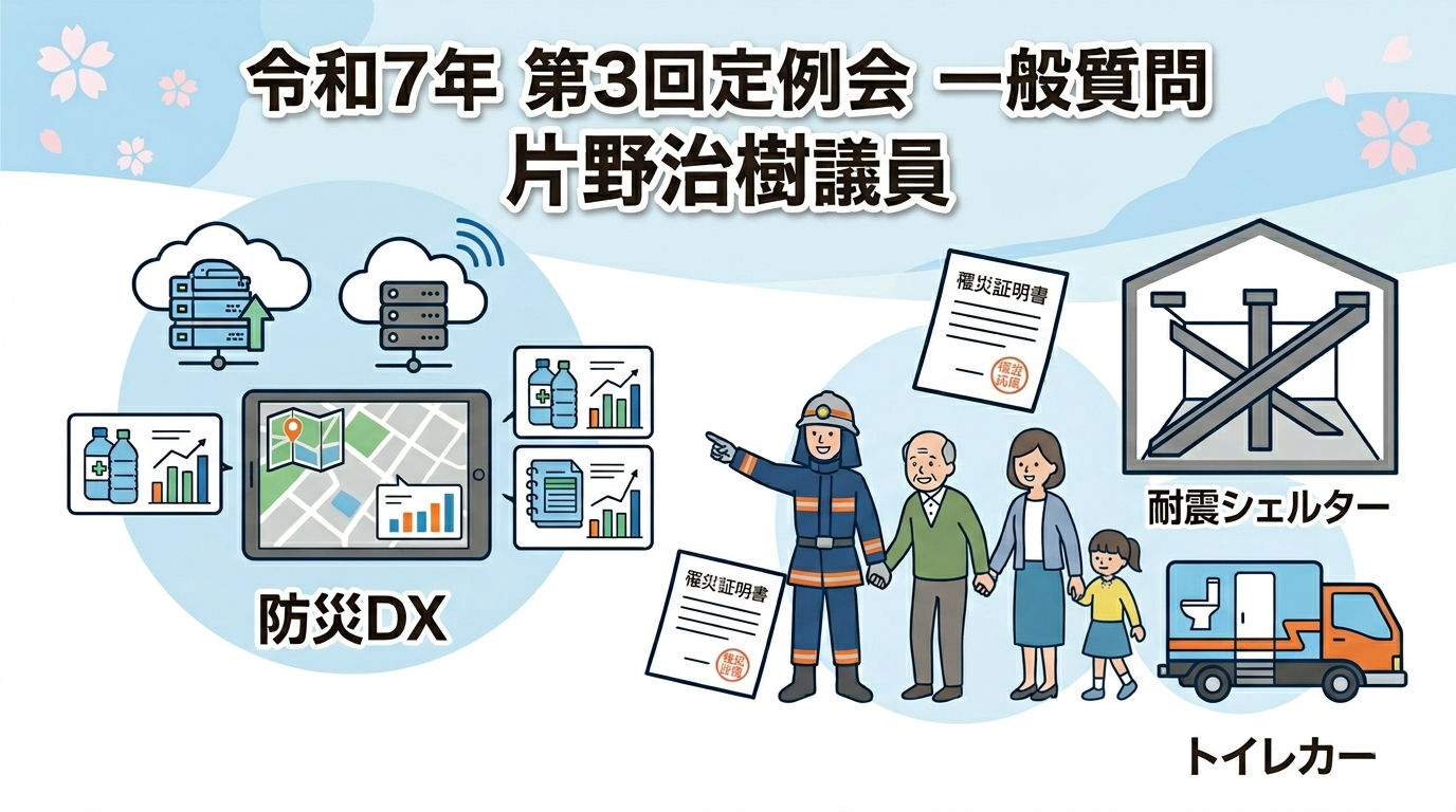 海津市の令和7年第3回定例会の一般質問において、片野治樹議員は「防災DXと協働支援の推進」について質問した。